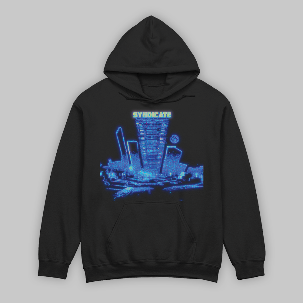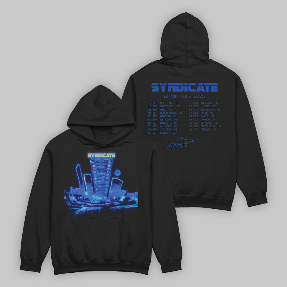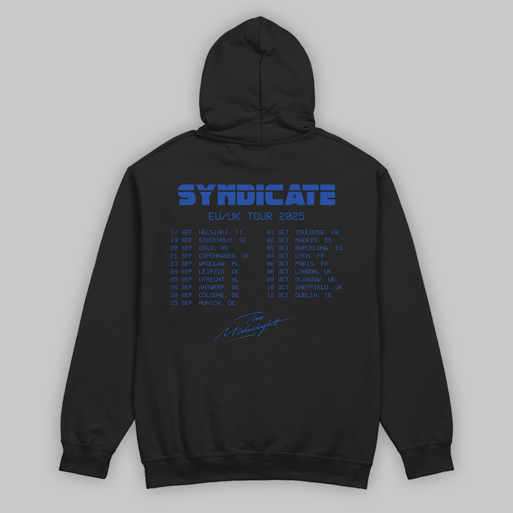 Black hoodie featuring 'The Syndicate' front print and EU/UK Tour 2025' back print.