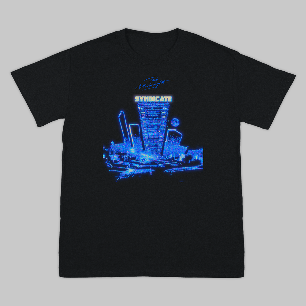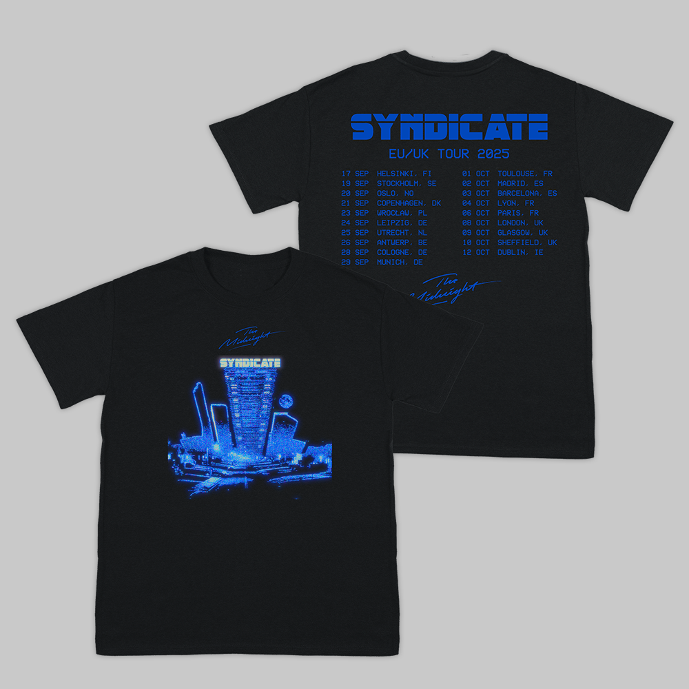 Black t-shirt featuring 'The Syndicate' front print and EU/UK Tour 2025' back print.